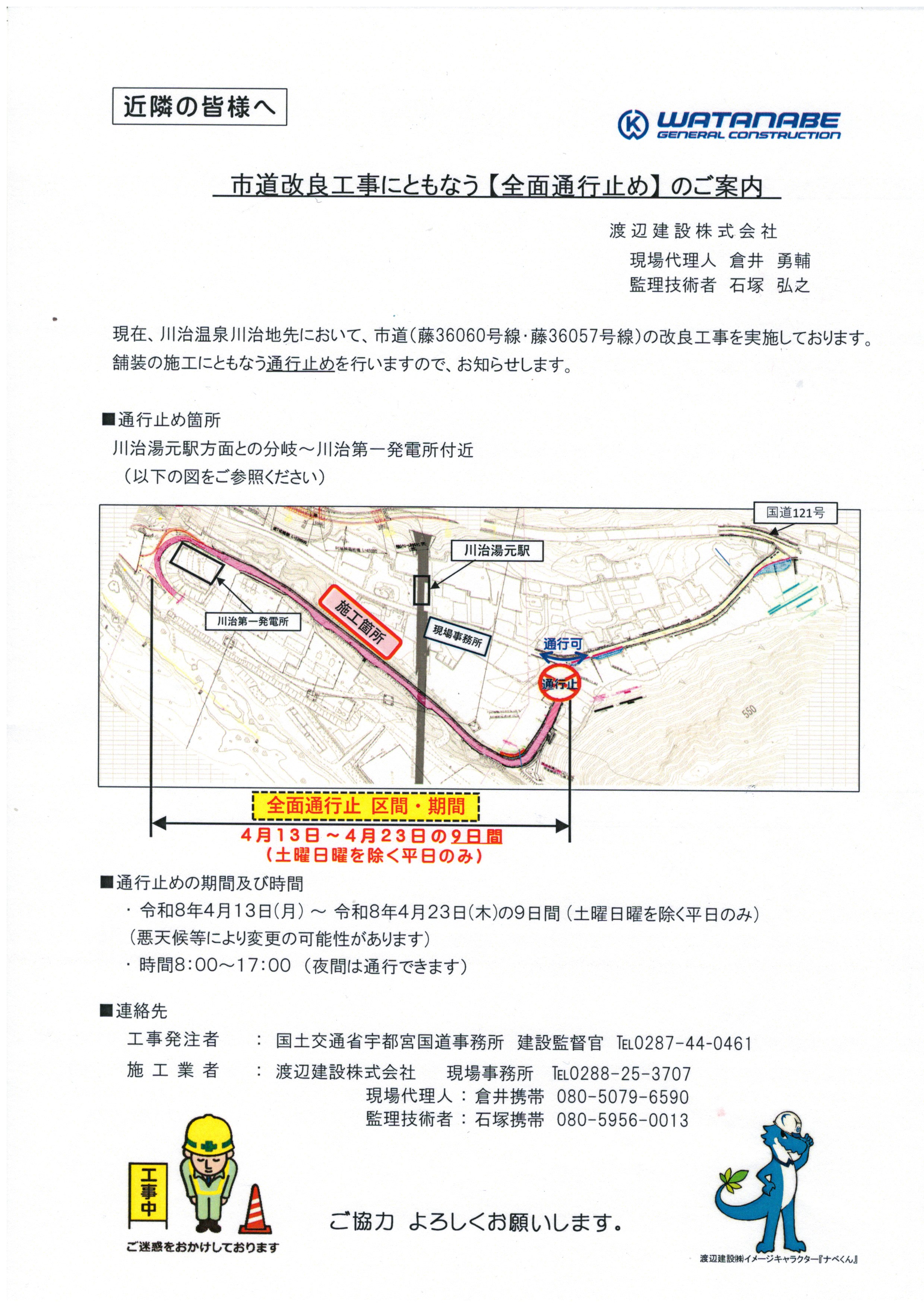 川治温泉薬師の湯に通じる市道が全面通行止めとなります。